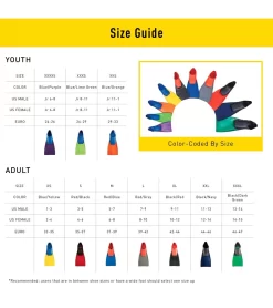 - Sizing- Blue/Lime Green size Jr. 8-11; Blue/Orange size Jr. 11; Blue/Yellow size Jr. 1-3; Red/Black size Jr. 3-5; Red/Blue Men size 5-7; Red/Grey Men size 7-9; Black/Red Men size 9-11; Black/Navy Men size 11-13; Black/Dark Green Men size 13-14