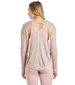 Workout during breezy evenings with the Free People Movement Lay Up Long Sleeve featuring stylish back cutouts and thumbhole accents.